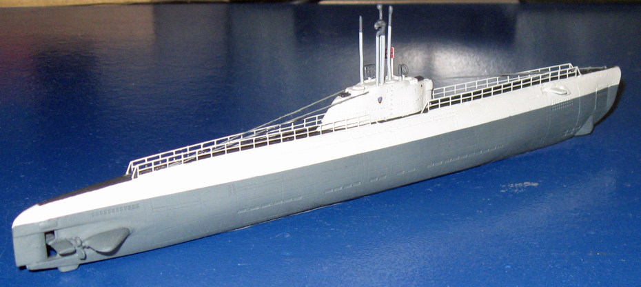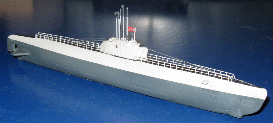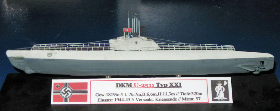 Deutsche Kriegsmarine (DKM) " U-2511 / Type XXI" (1621 to üW. 1819 to uW. total 2114to) KKpt: Adalbert Schnee Dienstzeit 29.09.1944 - 07.01.1946 (Deadlight/versenkt) Der Erste wirkliche U-Boot Type der Welt Eine Feindfahrt mit Scheinangriff (unbemerkt / Kriegsende). Bausatz: AFV-Club SE-73501, überarbeitet |
