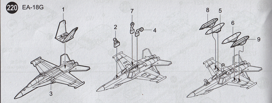 Modell: F-18G "Growler" Ausführung: Standmodell Besatzung: 2 Artikelnummer: 05638 Inhalt: 4 Flugzeuge Preis: Bausatz 05638 Besonderes: keine Glasteile, Naßschiebebilder-Satz 4x (VAQ-142) Bearbeitung: normal |