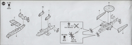 Modell: E-2D "Hawkeye" Ausführung: Standmodell Besatzung: 5 Artikelnummer: 05638 Inhalt: 2 Flugzeuge Preis: Bausatz 05638 Besonderes: keine Glasteile, Naßschiebebilder-Satz 2x (VAW-124) Bearbeitung: normal |