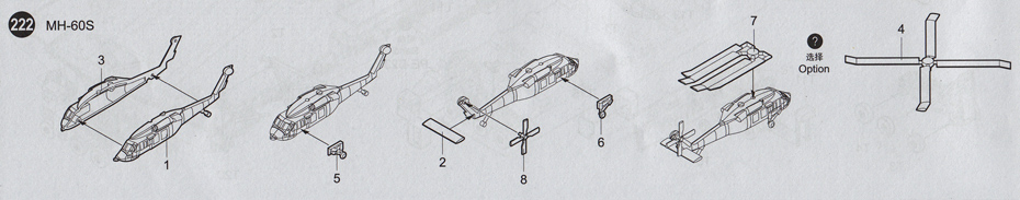 Modell: MH-60S "Black Hawk" Ausführung: Standmodell Besatzung: 4 Artikelnummer: 05638 Inhalt: 4 Hubschrauber Preis: Bausatz 05638 Besonderes: keine Glasteile, Naßschiebebilder-Satz 4x (HSC-9) Bearbeitung: normal |