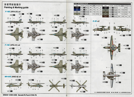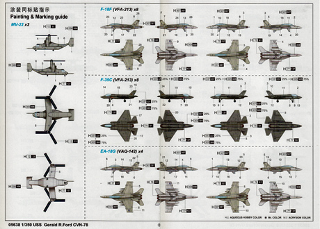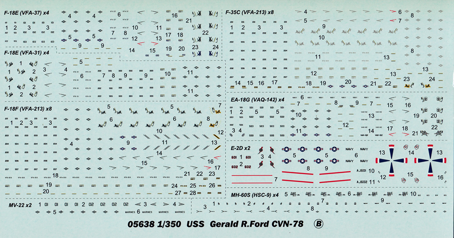 Inhalt Flugzeuge F-35C "Lightning-II" 8x F-18F "Hornet" 8x F-18E "Hornet" 8x EA-18G "Growler" 4x E2-D "Hawkeye" 2x MV-22 "Osprey" 2x Gesamt: 36 Stück |