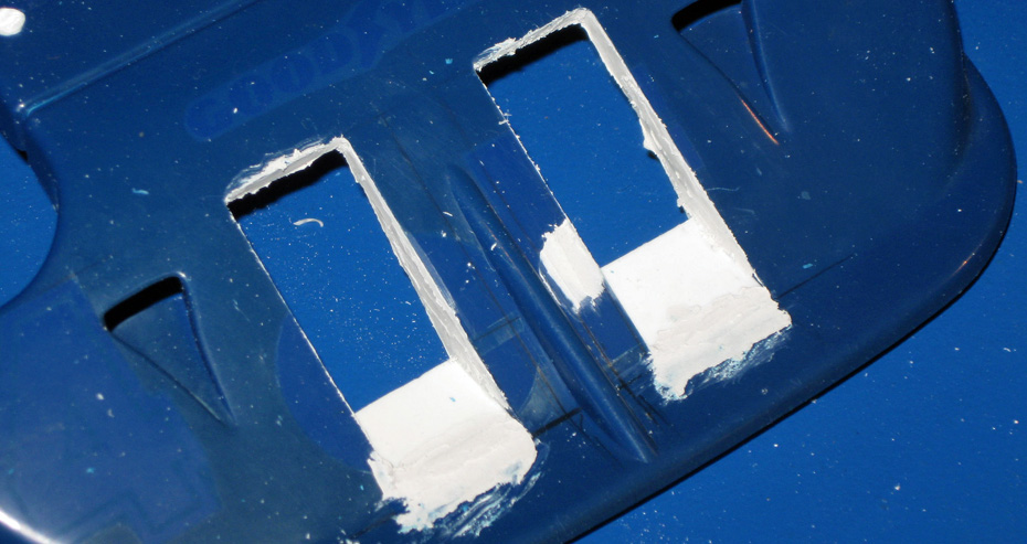 24. Ausfräsen der Lufteinlässe im Frontspoiler, die weissen Spähne sind von der rückseitigen Verstärkung aus Polysterol. | |||||||||||||||||||||||||||||||||||||||||||||||||||