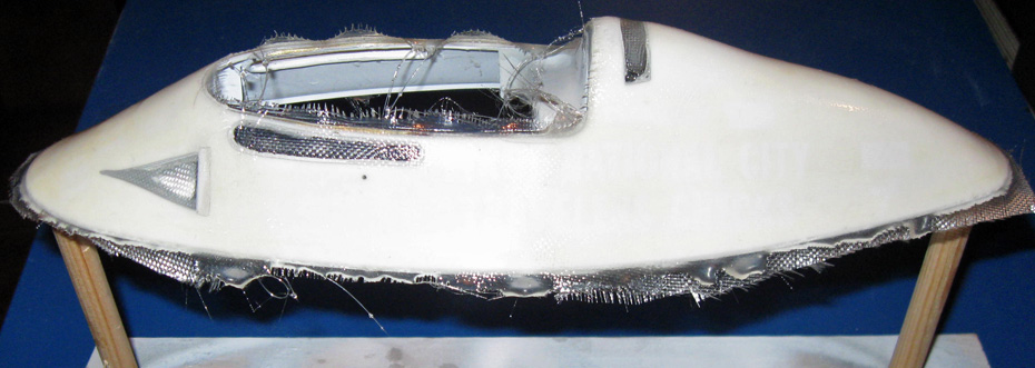 58. Das Monocoque mit der zurechtgeschnittenen Glasfasermatte vor dem Schleifen. |