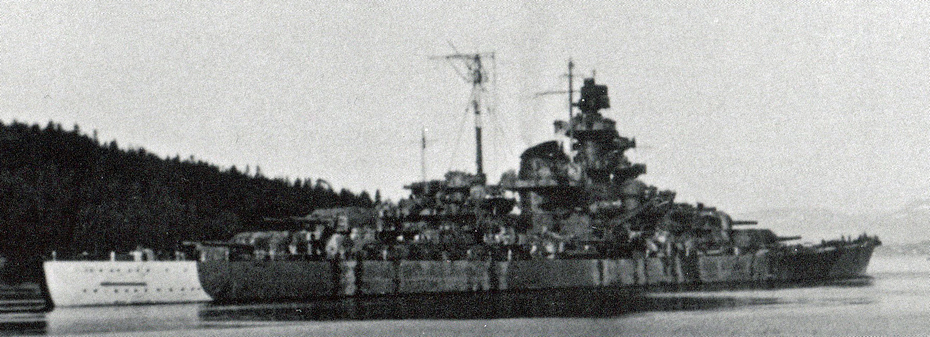 Geschichte der "Tirpitz" Bauserie: Bismarck-Klasse / Kiellegung: 24.10.1936 / Stapellauf: 01.04.1939 / Indienststellung: 25.02.1941 / Verbleib: 12. November 1944 gekentert vor der Insel Håkøya im Fjord bei Tromsø. Technische Daten Art: Schlachtschiff / Gewicht: 53500 to / Länge: 253,6 m / Breite: 36 m / Höhe: 59,5 m / Tiefgang: 10,61 m / Schrauben: 3x 4,70 m, kn: 30,8 / Ruder: 2 paralell / Leistung: 163026 PS / Fahrstrecke: 9280 sm bei 19 kn / Bunker: 4235 to Heizöl max./ Besatzung: 2608 Mann (1943) Bewaffnung: 8x 38,1cm L-47, 12x 15cm L-55, 16x 10,5cm L-65 (Flak), 16x 3,7cm L-83 (Flak), 78x 2cm (Flak), 8x 53,3cm Torpedorohre, 2x Vierlingssätz, 1x je Seite mittig / Flugzeuge: 4x Arado Ar-196(A3) / Panzerung: Gürtel 320mm, Zitadelle 145mm, Deck 80-120mm, Türme A,B,C,D, 130-360mm, Barbetten 340mm. | ||||||||||||||||||||||||||||||||||||||||||||||||||