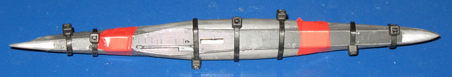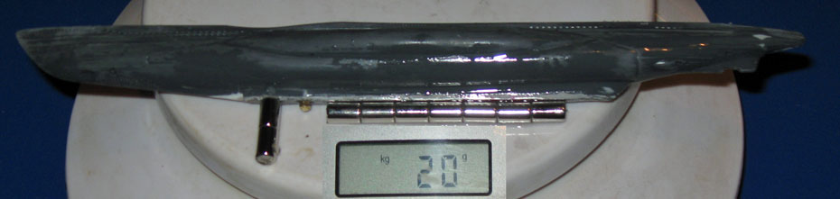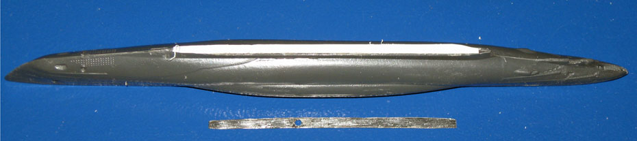 | 1. Auf dem Kiel befestige ich einen 0,5mm Polysterolstreifen zur Stabilisierung und einen 0,3mm Blechstreifen zur Magnetisierung. | |||||||||||||||||||||||||