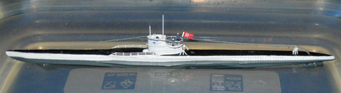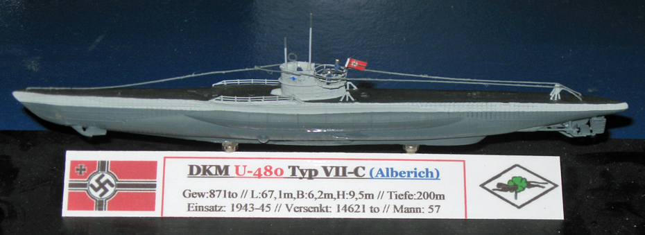 Deutsche Kriegsmarine (DKM) " U-480 / Type VII-C" (805 to üW. 909 to uW. total 1094to mit "Alberich" Beschichtung) Olt.zS: Hans Joachim Förster Dienstzeit 06.10.1943 - 20.02.1945 versenkt (Mine). Das Erste Tarnkappen U-Boot der Welt Versenkt/Priese: 4 Schiffe mit 14621 to Bausatz: Revell 05093, überarbeitet |