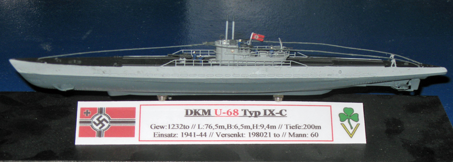 Deutsche Kriegsmarine (DKM) " U-68 / Type IX-C" (1120 to üW. 1232 to uW. total 1540to) KptLt: Karl-Friedrich Merten / Olt.zS: Albert Lauzemis Dienstzeit 11.02.1941 - 10.04.1944 versenkt Das erfolgreichste U-Boot diese Types Versenkt/Priese: 33 Schiffe mit 198021 to Bausatz: Hobby Boss 83508, überarbeitet |