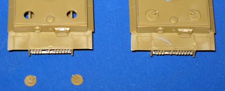 | 5. Zusammenbau des Turmes 5 Als letzte Arbeit beim Turmzusammenbau wird die Notausstiegsluke auf der rechten Seite hinter den 3 Kettengliedern angebracht. |