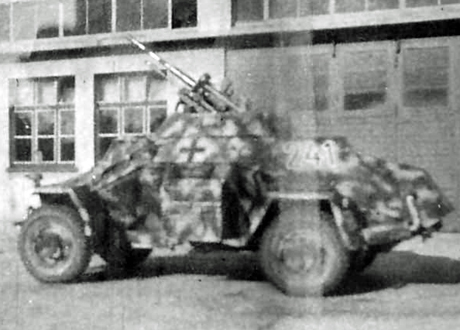 Erläuterung: Der leichte Panzerspähwagen Sd.Kfz. 222 war ein weiteres Fahrzeug dieser Baureihe er wurde von 1935 bis 1943 gebaut. Das Fahrzeuge war als Unterstützungsfahrzeug für die Aufklärungs-Einheiten bestimmt. Die Bewaffnung bestand aus einem MG-34 und einer paralell eingebauten 2cm KwK 30 / L38. Die Ausführung des Sd.Kfz. 221 mit Panzerbüchse 39 sieht auf undeutlichen Bildern dem Sd.Kfz. 222 zum Verwechsel ähnlich. |