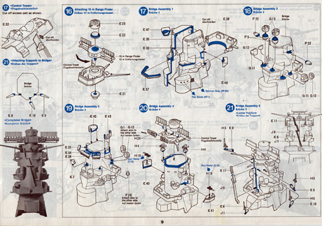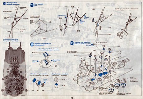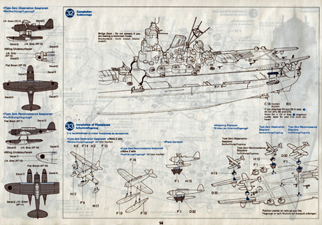 Bausatz Tamiya 78004 "IJN Musashi“ Bausätze der Firma Tamiya vom japanischen Schlachtschiff "Musashi" im Maßstab 1:350. Tamiya 78004 / 78016 (65.-€) RC-fähig / einteiliger Rumpf, Rüstzustand zwischen 1941-45 also weder noch, der Mast und somanches Andere ist allerdings total falsch (Mastbeine 1-2 statt 2-1 (siehe oben Decksteile).