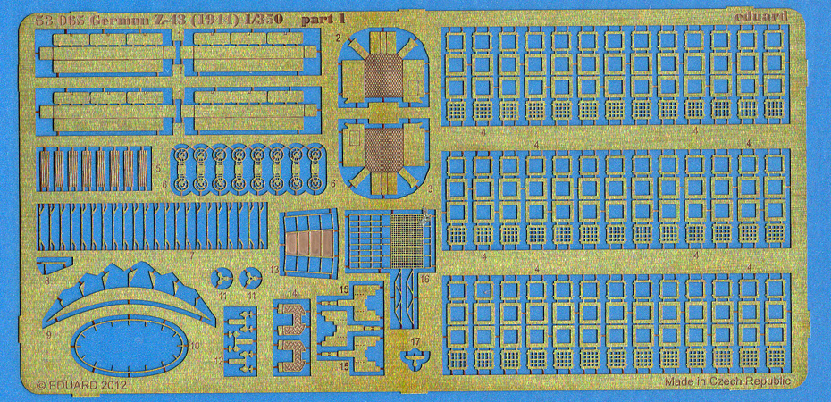 Ätzteil-Platinen Modell: DKM Z-43 / Ausführung: Standmodell Artikelnummer: Eduard 53065 Teile: 80 verschiedene (beide zusammen) Material: Kupfer Material-Stärke jede: 0,13mm Preis: ca. 23.- € |