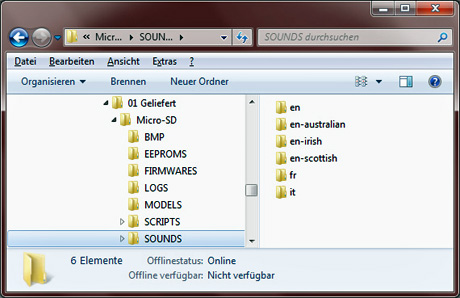 | 3. Die gespeicherte Datei "de" auswählen und in Sounds kopieren. | 4. Die Datei Sounds mit deutschen Texten für das Update. | ||||||||||||||||||||||||||||||||||||||